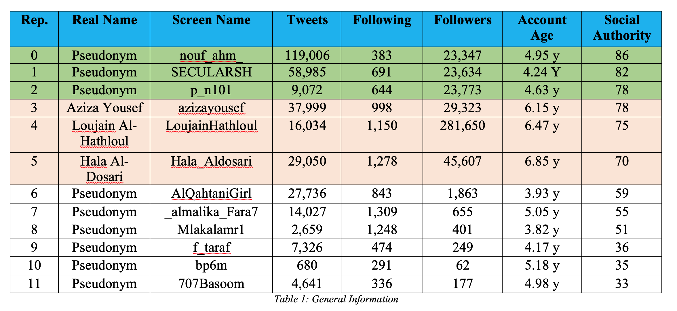 a. I have extracted the activists’ account names and real names if applicable, total number of tweets, followings, and followers, and account age as shown in Table 1 below.