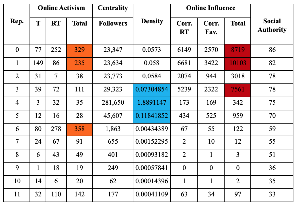 a. To measure network density, I have divided the actual connections (the number of each activist’s followers) by the potential connections (the sum of all activists’ followers subtracted by each activist’s followers). See Table 2 for details.