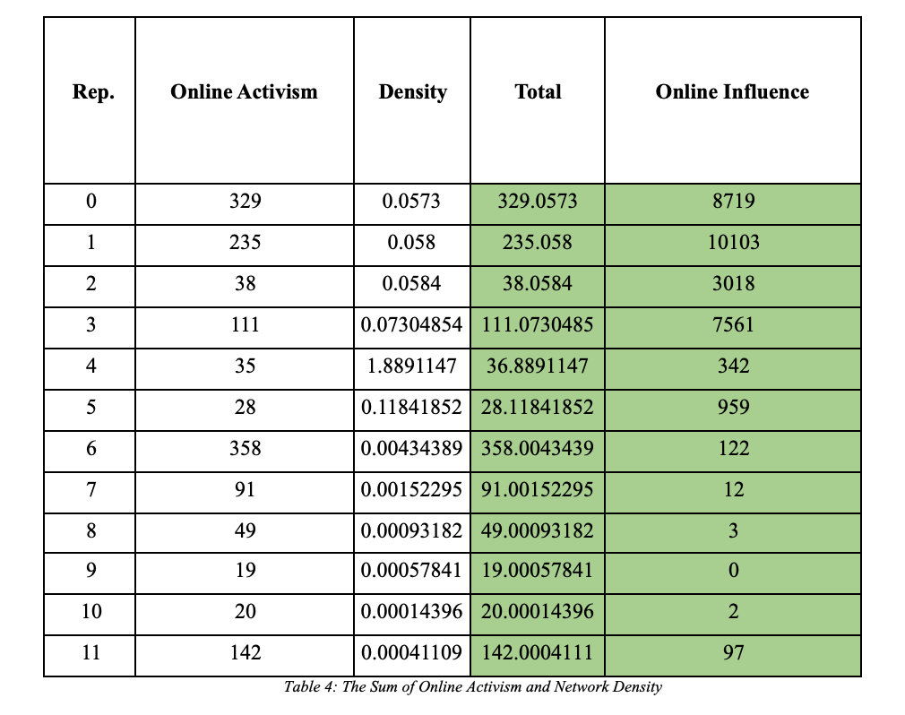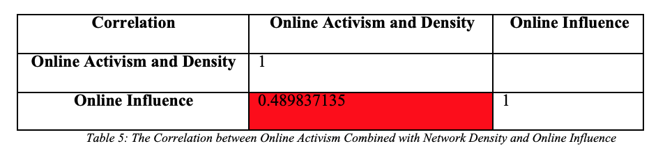 Based on the result in Table 5 above, the correlation score is 0.4 89837135 which means that there is a positive correlation between the two variables. As a result, the data shows that augmented online activism and high network centrality and density are both essential for better information transmission and greater awareness, hence high online influence. Since high online activism and network centrality and density are key in effecting online influence, and the circulation of discourse (online activism and online influence) is responsible for creating a public and affecting the conditions/ways of achieving social and political purposes, then the magnitude of a public and activism results (online influence) are contingent on network centrality and density.