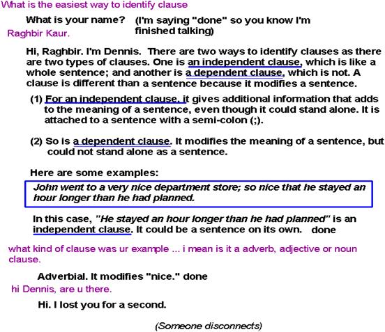 If Dennis had chatted with Raghbir for a while, rather than holding forth on clauses immediately, he might have proceeded with a much better sense of who Raghbir was. Dennis shouldn’t, of course, waste time and violate the unwritten rules of respecting online privacy by asking Raghbir personal questions. There’s no need to know, for instance, where she lives or what her college major is, though he may want to ask what course she happens to be taking that pays special attention to clauses, and whether she’s preparing for an exam on clauses or just trying to understand her instructor’s warning that her writing shows problems with clauses.