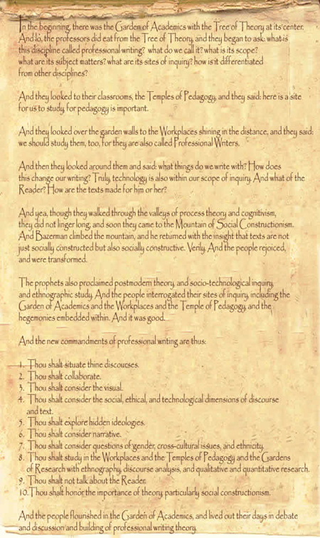 In the beginning, there was the Garden of Academics with the Tree of Theory at its center. And lo, the professors did eat from the Tree of Theory, and they began to ask: what is this discipline called professional writing? what do we call it? what is its scope? what are its subject matters? what are its sites of inquiry? how is it differentiated from other disciplines?