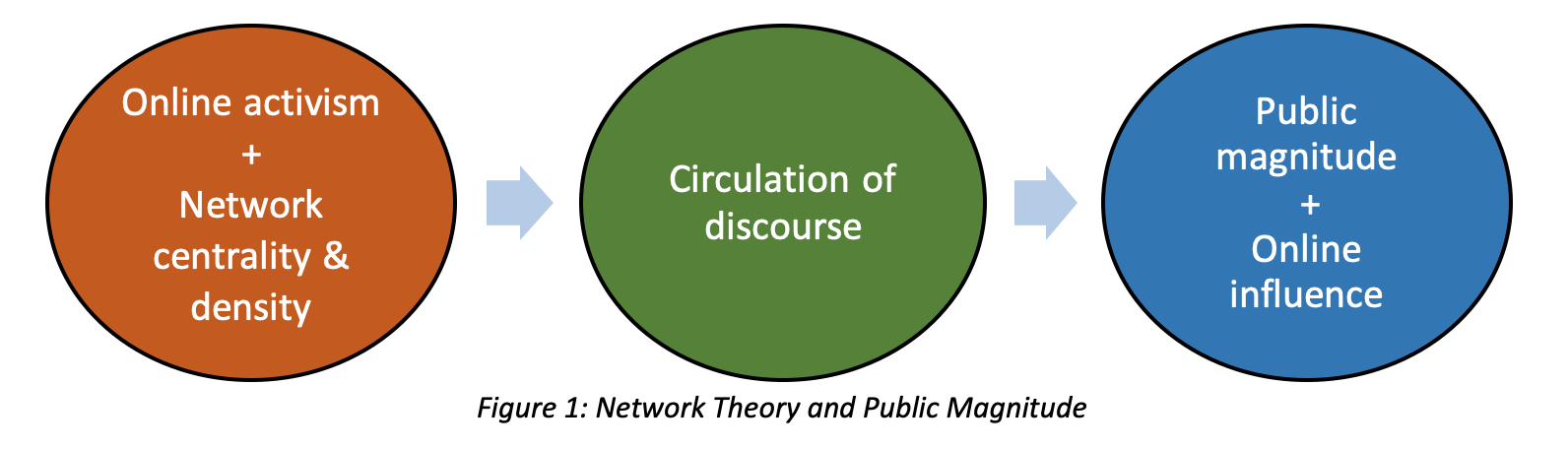From a rhetorical perspective, Michael Warner (2002) in “Publics and Counterpublics” argues that rhetorical circulation creates publics, saying: “The existence of a public is contingent on its members’ activity … A public is the social space created by the reflexive circulation of discourse” (pp. 61-2). Further, Brandon Inabinet (2012) in “Democratic Circulation: Jacksonian Lithographs in U.S. Public Discourse” shows how circulation of images is germane to the ways in which social change can be achieved. Nevertheless, Sean O’Rourke (2012) in “Circulation and Noncirculation of Photographic Texts in the Civil Rights Movement: A Case Study of the Rhetoric of Control” illustrates how strategic circulation can buttress political purposes. Based on the literature above, we can conclude that high online activism intensity, combined with high network centrality and density, yield effective transmission and greater awareness, hence high online influence. The circulation of discourse (online activism and online influence) is responsible for creating a public and affecting ways to achieve social and political objectives. Therefore, I argue that online activism combined with network centrality and density can affect the circulation of discourse, the magnitude of a public, and the activism results (online influence) as illustrated in Figure 1.