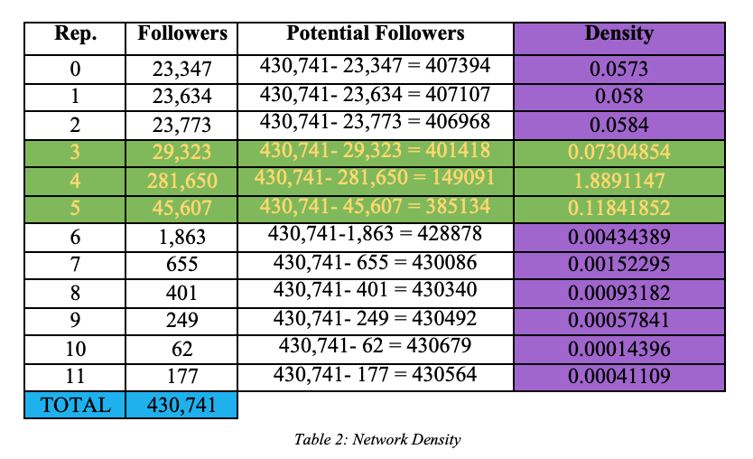 a. To measure network density, I have divided the actual connections (the number of each activist’s followers) by the potential connections (the sum of all activists’ followers subtracted by each activist’s followers). See Table 2 for details.