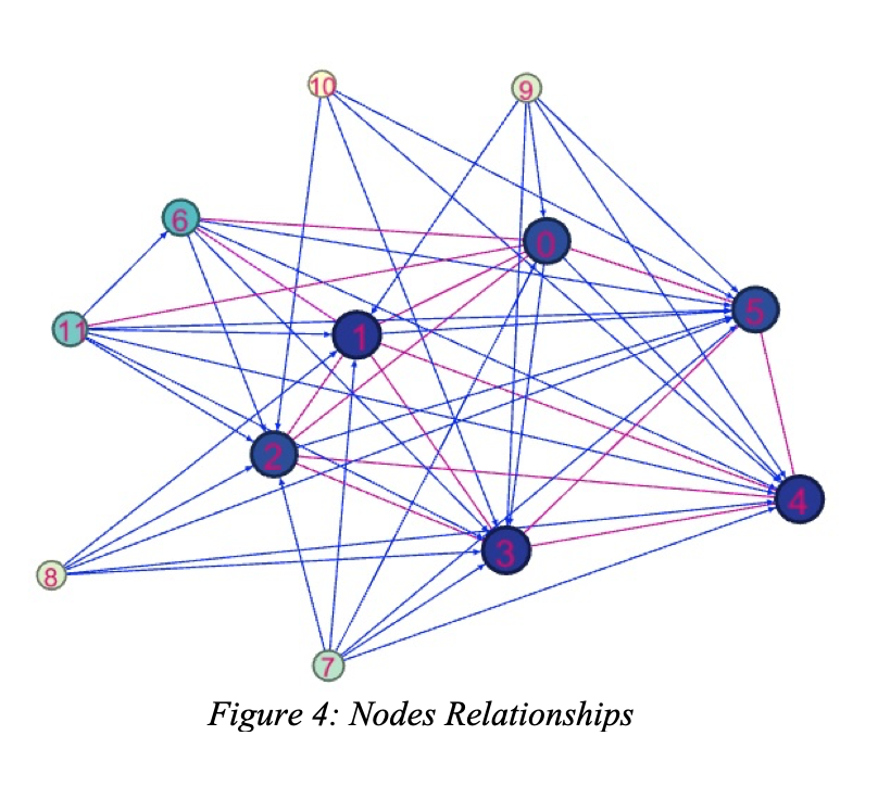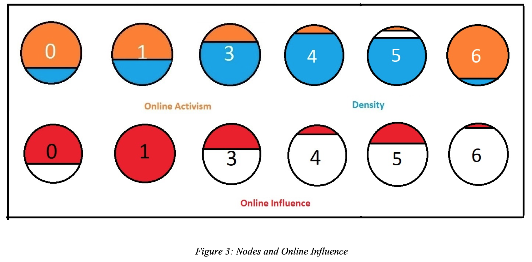 As we can see in Table 3 above, the top three nodes who scored the highest online activism intensity are nodes 0,1, and 6; nodes 3,4, and 5 are the top three in scoring the highest betweenness/centrality scores (number of followers) and accordingly, the highest network density; and the top three nodes who scored the highest online influence are nodes 0,1, and 3. We notice that nodes 4 and 6, the highest network density and the highest online activism intensity among the group, respectively, score very minimal in online influence. However, node 1, the highest online influence among the group, scores lower than nodes 4 and 6 in network density and online activism intensity, respectively. To avoid confusion, Figure 3 below is a visual illustration, although not precise, of the nodes that I have mentioned and their online activism, network density, and online influence relationships among each other.